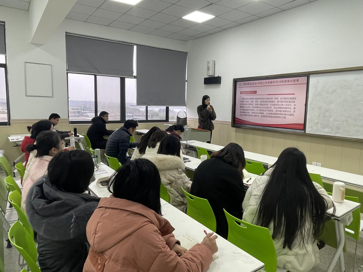 马克思主义学院刘甜同志应邀作题为《奋进新征程,建功新时代》的专题报告,从二十大的主题和主要成果、过去五年的工作和新时代10年的伟大变革、马克思主义中国化的重点论断、重要论述、坚持党的全面领导和全面从严治党的重大部署等七个方面对党的二十大报告的结构和内容作出深度解读。刘甜同志指出,党的二十大报告结构紧密、逻辑严密、文字缜密,内容总结实、理论新、擘画全,要从整体把握、重点突出和联系实际这三个维度,全面系统学习、深刻领会把握、深入贯彻落实党的二十大精神。