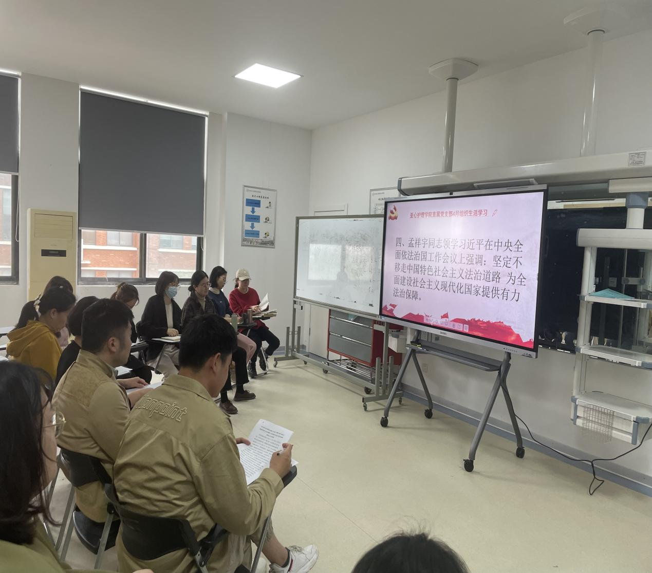 本次会议主要包含五项内容,会议第一项,党支部书记康爱梅同志领学习近平在中国共产党第二十次全国代表大会上的报告摘录:《七、坚持全面依法治国,推进法治中国建设》;会议第二项,由全体教师提前自学习近平总书记《论坚持全面依法治国》摘录:《习近平总书记主持中共十九届中央政治局第二十次集体学习时的重要讲话:充分认识颁布实施民法典重大意义,依法更好保障人民合法权益》;邀请教工党员王勇进同志和入党积极分子欧阳利芬老师分享学习心得;会议第三项,由宣传委员董晨程同志领学《习近平法治思想学习纲要》摘录:《党的领导是中国特色社会主义法治之魂》;会议第四项,孟祥宇同志领学“习近平在中央全面依法治国工作会议上强调:坚定不移走中国特色社会主义法治道路 为全面建设社会主义现代化国家提供有力法治保障”。