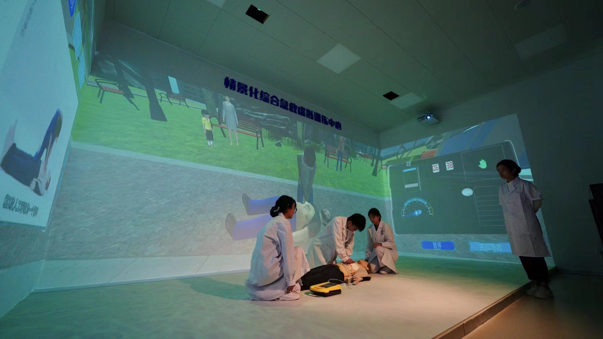 实验室概况:我校是教育部批准全国学校急救教育试点学校。为确保急救教育的开展,学校投资60多万建成情景化虚拟仿真训练中心。该中心占地面积约120平方米,建有CAVE四面融合沉浸式交互式教学系统、综合急救虚实结合训练系统。