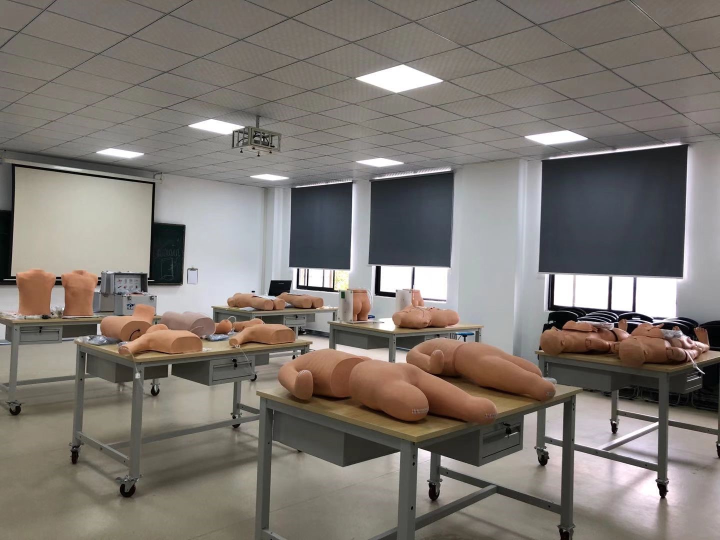 实验室设备:多媒体教学机、骨折包扎模型、缝合训练模型、胸腔闭式引流模型、清创换药模型、生物学显微镜等。