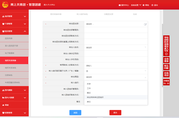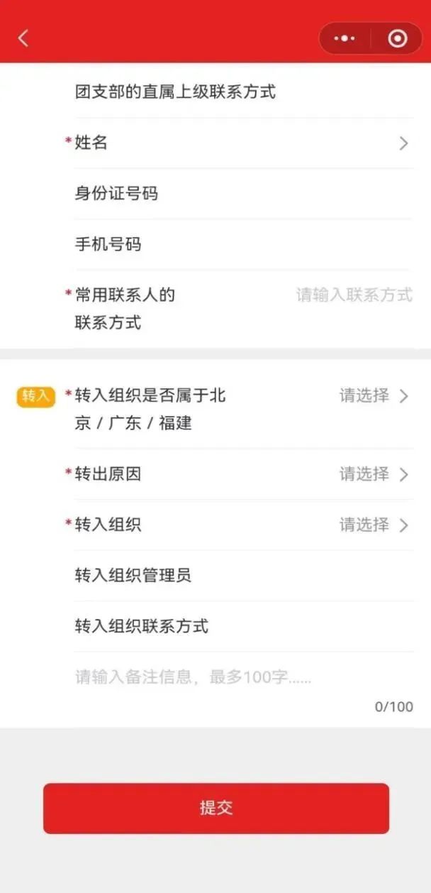规范填写相关信息并提交申请:准确填写带“*”的内容框,转出原因、申请转入组织等(升学/工作单位、地址等),必须严格按照业务指引要求转入正确的团组织。确定信息无误后即可提交。