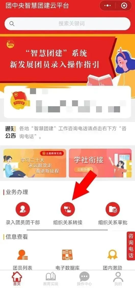 微信搜索“团中央智慧团建云平台”,点击并登录。(账号为团员身份证号码,初始密码为身份证后八位)团员个人发起的情况,可以由团员登录系统进入个人中心,①点击左侧“关系转接”,②选择转入组织是否属于北京/广东/福建、③转接原因,根据提示选择完成申请。