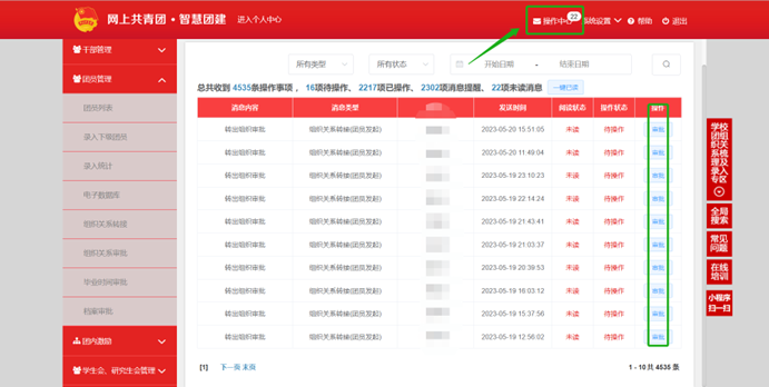 ①同上述流程进入智慧团建系统,点击右上角“操作中心”,查看团组织信息。