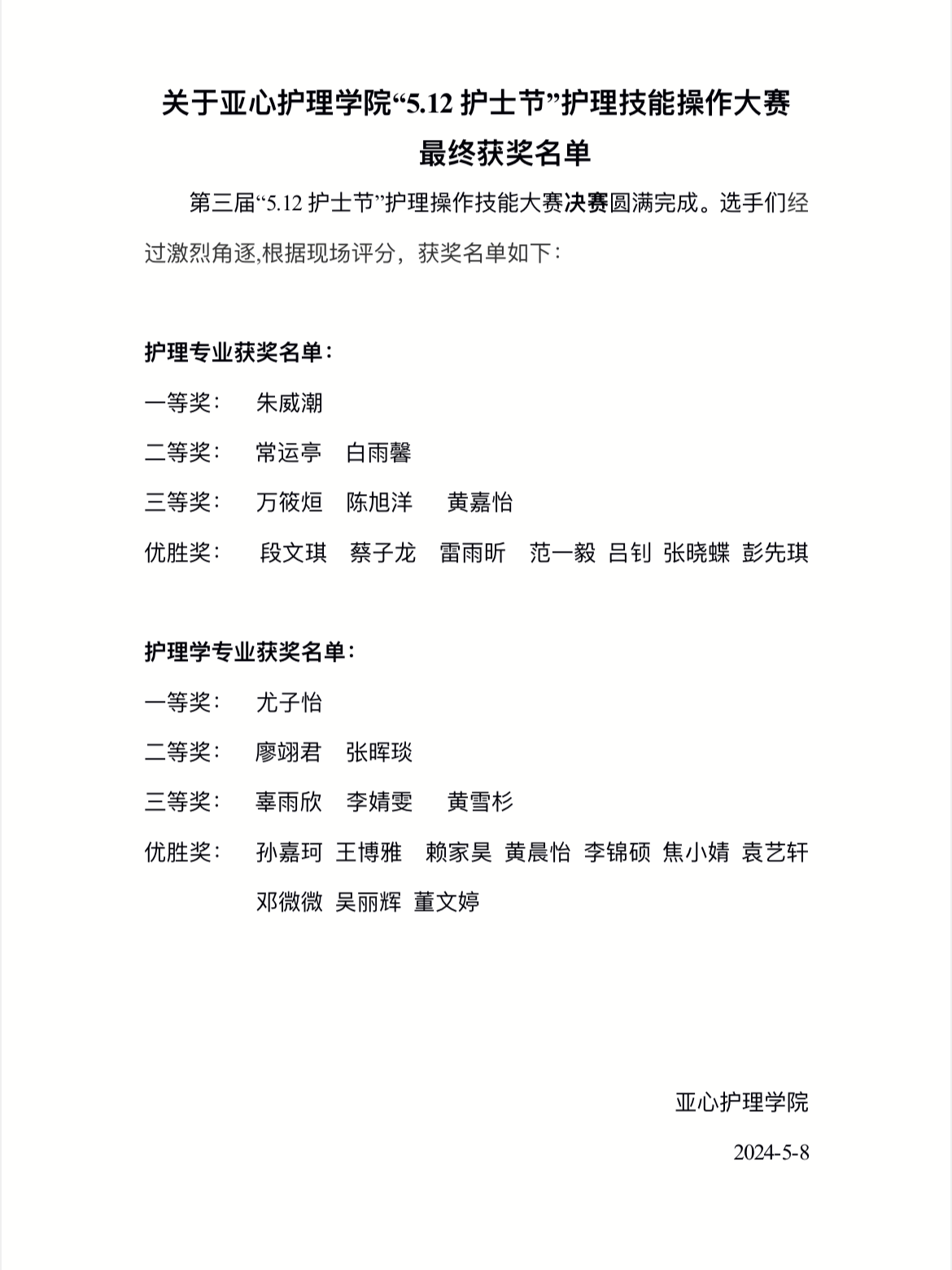 5月7日我院第三届护理操作技能大赛决赛圆满结束,此次比赛邀请了武汉亚心总医院洪迎护士长和武汉亚洲心脏病医院李翠总带教来担任评委老师。