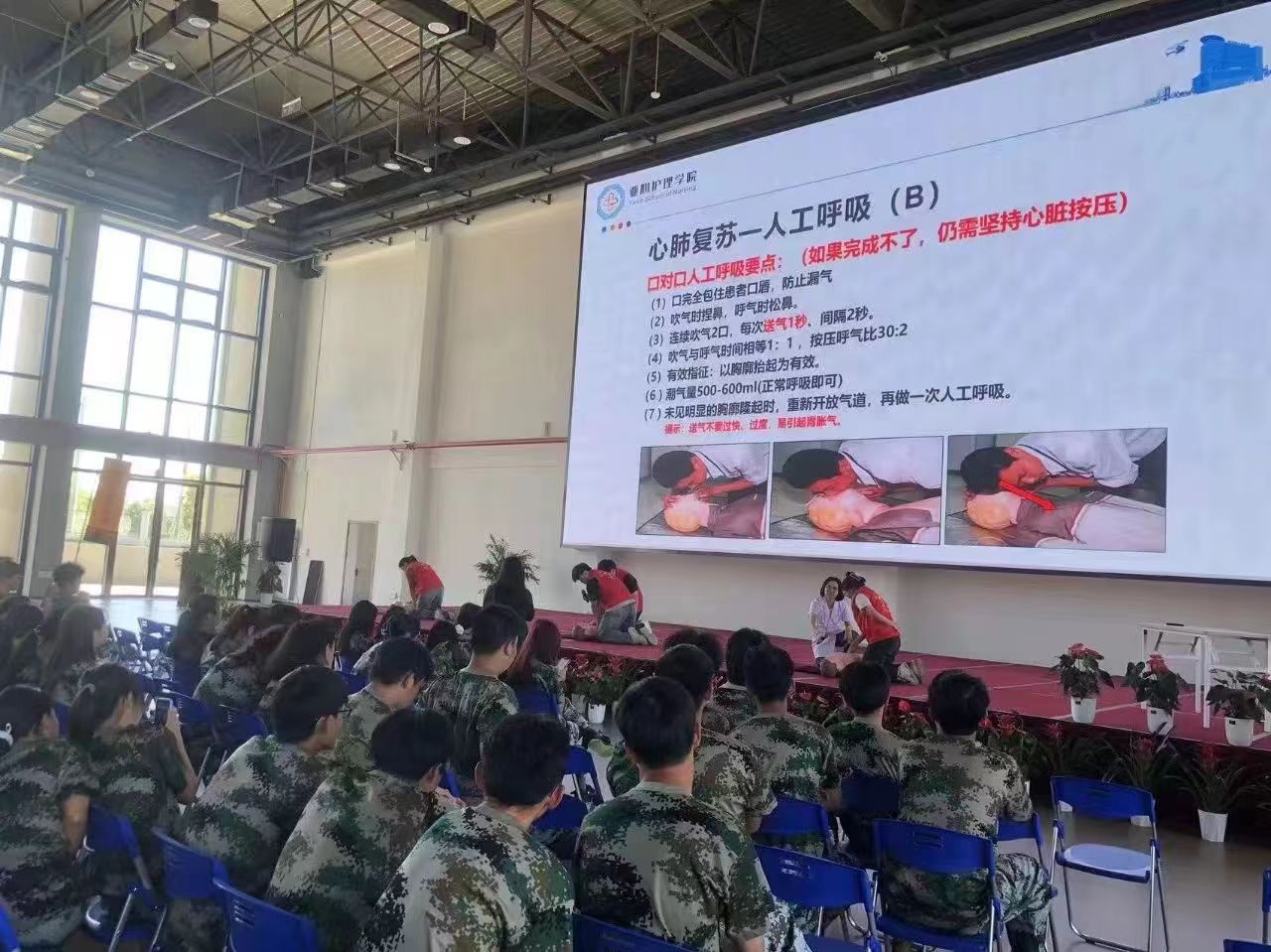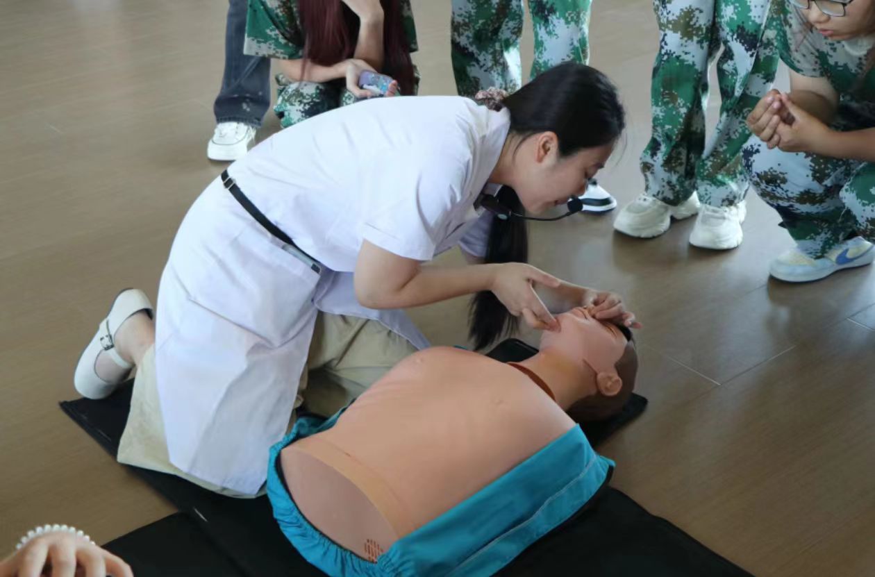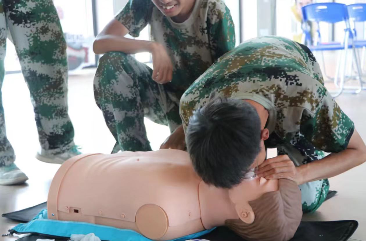 在理论学习之后,同学们分组进行了实操模拟训练。老师们和志愿者们对大家的操作进行了细致的现场指导,确保每位同学都能掌握正确的操作方法、力度和节奏。