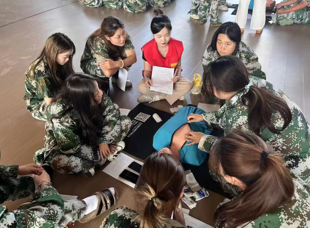 下午的培训中,何老师继续讲解了海姆立克急救法和伤口包扎技巧,并引导同学们进行模拟训练。训练结束后,同学们信心十足地参加了考核,现场氛围活跃。