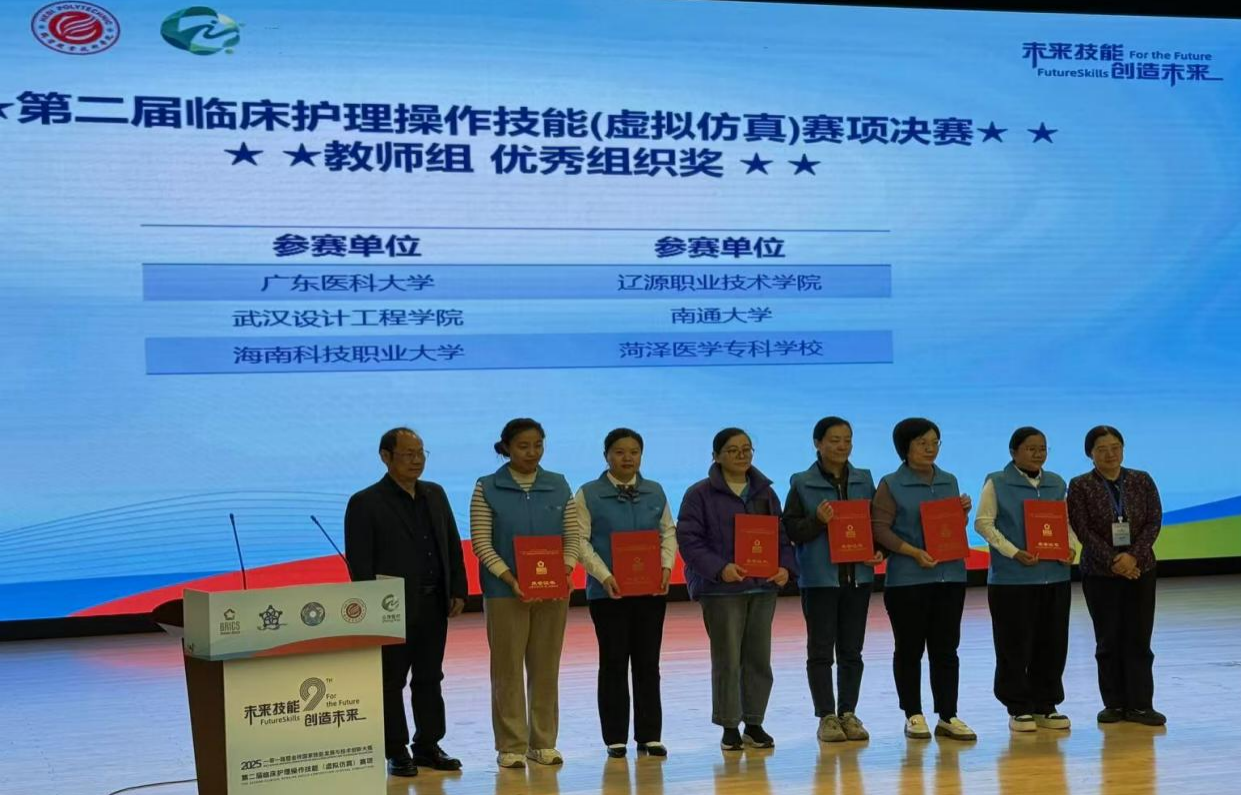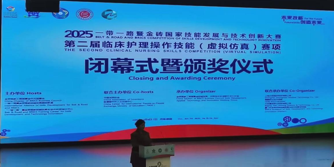2025年12月5日至7日,2025一带一路暨金砖国家技能发展与技术创新大赛“第二届临床护理操作技能(虚拟仿真)赛项决赛”在河南鹤壁职业技术学院隆重举行。本次大赛参赛院校涵盖了985、211本科院校以及众多中高职院校,经过激烈角逐,我校教师团队凭借扎实的专业功底和出色的教学能力,在教师组混合式教学设计赛项中荣获全国二等奖,充分展现了我校护理专业教师队伍的教学水平和创新实力。